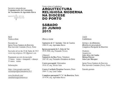 2- No mesmo dia, às 21h30 decorrerá na igreja de Nossa Senhora da Boavista (Foco - Porto) a conferência "Serviço e Acolhimento - História de um projecto", dedicada à arquitectura religiosa moderna portuguesa com enfoque nas igrejas projectadas por Agostinho Ricca, em particular na igreja no parque residencial. São obras de excelência de um autor cujo percurso ímpar ressalta no panorama da renovação da arquitectura religiosa moderna realizada em Portugal na segunda metade do século XX.